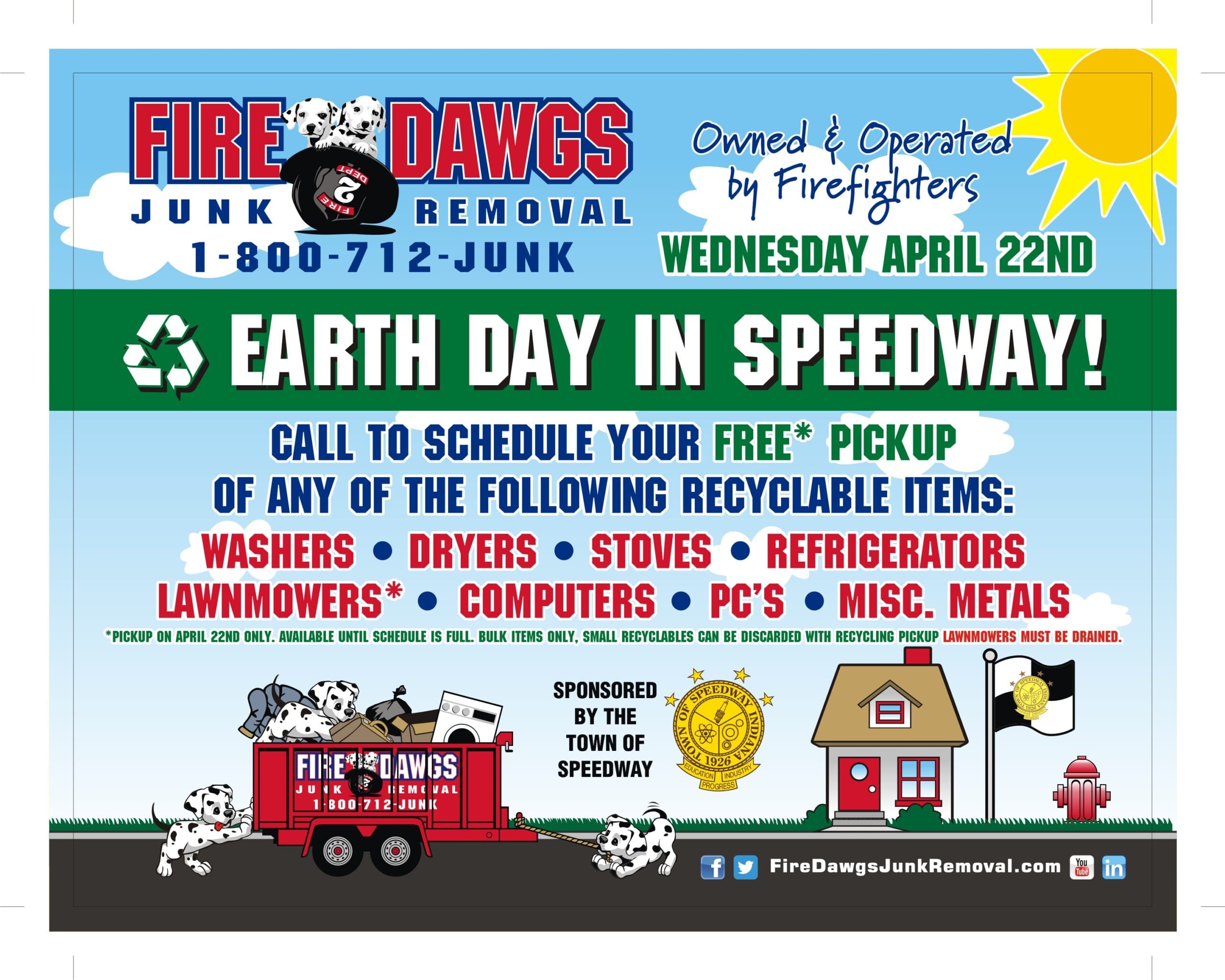 Earth Day was started in 1970 and on April 22nd every year worldwide events and efforts are made in order to better educate the population on preserving our environment. In order to be a part of such an important event Fire Dawgs, along with the Town of Speedway, is hosting an Earth Day Clean Up in Indianapolis. On Wednesday, April 22nd Fire Dawgs will come to your home for free and collection any large, unwanted recyclables. You need to call us at 1-800-712-JUNK to schedule this pick up in advance. Examples of large recyclables include: washers, dryers, refrigerators, stoves and computers. Then on April 25th our brother company, Dumpster Dawgs, will have a dumpster located at Allison Elementary School (5240 W. 22nd St., Speedway, IN) from 10 a.m. to 1 p.m. for you to drop off any items. We hope you are able to take advantage of these events which are beneficial both to your wallet and the world! Not to mention having a little more space in your home. Thank you for helping us take care of Earth!