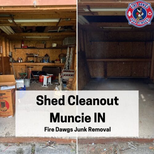 What is the price of cleanouts Muncie service? We gauge the cost on how much space your items fill up in our 16-cubic yard mini dump truck. But how is our pricing broken down? We start at a minimum and increases based on the volume of your junk we load into our truck. We include all the labor, transportation, and disposal fees at one final cost! But what’s the best part about choosing Fire Dawgs Junk Removal? We reuse, recycle, or donate over 60% of the items that we haul away! Helping you keep Muncie green!